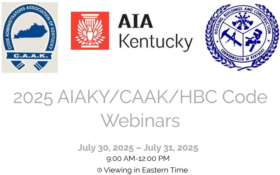 AIA Kentucky, the Code Administrators Association of Kentucky and the Kentucky Department of Housing Buildings and Construction once again join forces to present our annual summer code webinars for architects, code officials, related design professionals and others seeking understanding of the Kentucky Building Code. This year’s series will be delivered in the form of two, half-day webinars.